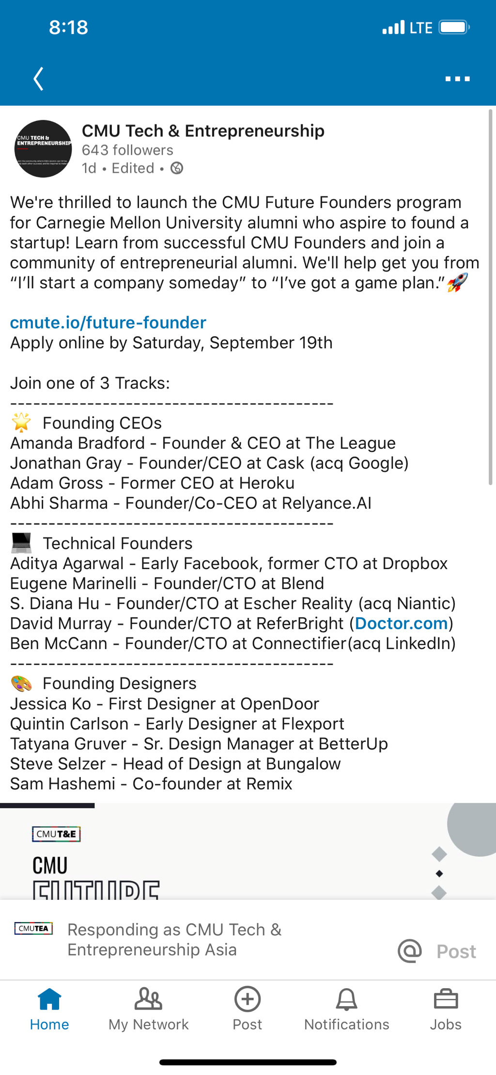 Calling CMU founders! We're thrilled to launch the CMU Future Founders program for alumni who aspire to found a startup! Learn from successful CMU Founders and join a community of entrepreneurial alumni. Contact @Kishan Patel for any questions.